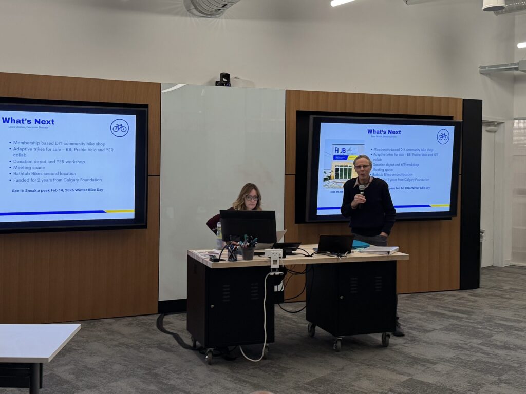 Executive Director Laura Shutiak shared an exciting vision for what’s next, including the development of a membership-based DIY community bike shop, donation depot, and Youth en Route workshop, meeting space, and a second location for Bathtub Bikes. Funded for two years through the Calgary Foundation, this future hub will serve as a physical home for learning, repairing, sharing, and connecting — a place where sustainability, skill-building, and community come together.